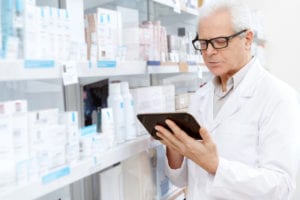 man using table in pharmacy