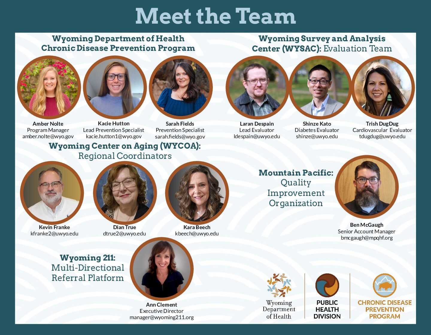 The Chronic Disease Prevention Program works with federal agencies, state programs, and community partners to help address the risk factors associated with chronic diseases like diabetes and hypertension. We work to make sure that the healthy choice is the easy choice for Wyoming communities.